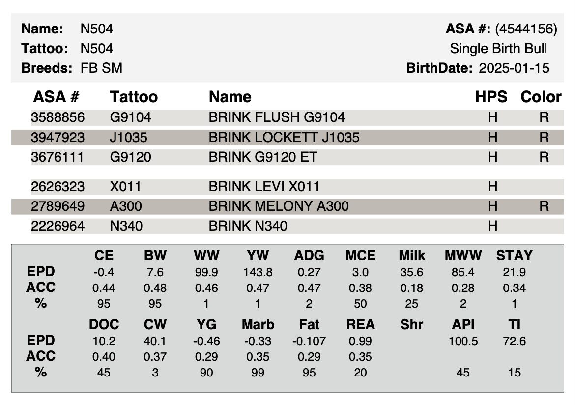 This bull is all about performance, topped with maternal strengths from the great 12 year old Melony A300, weaning a 1000 lb. machine. Melony and herdsire Flex share the same great cow N340. This guy has extra stretch with depth and correctness. He ranks in the top 1 percent of all Fullbloods in his performance epds.