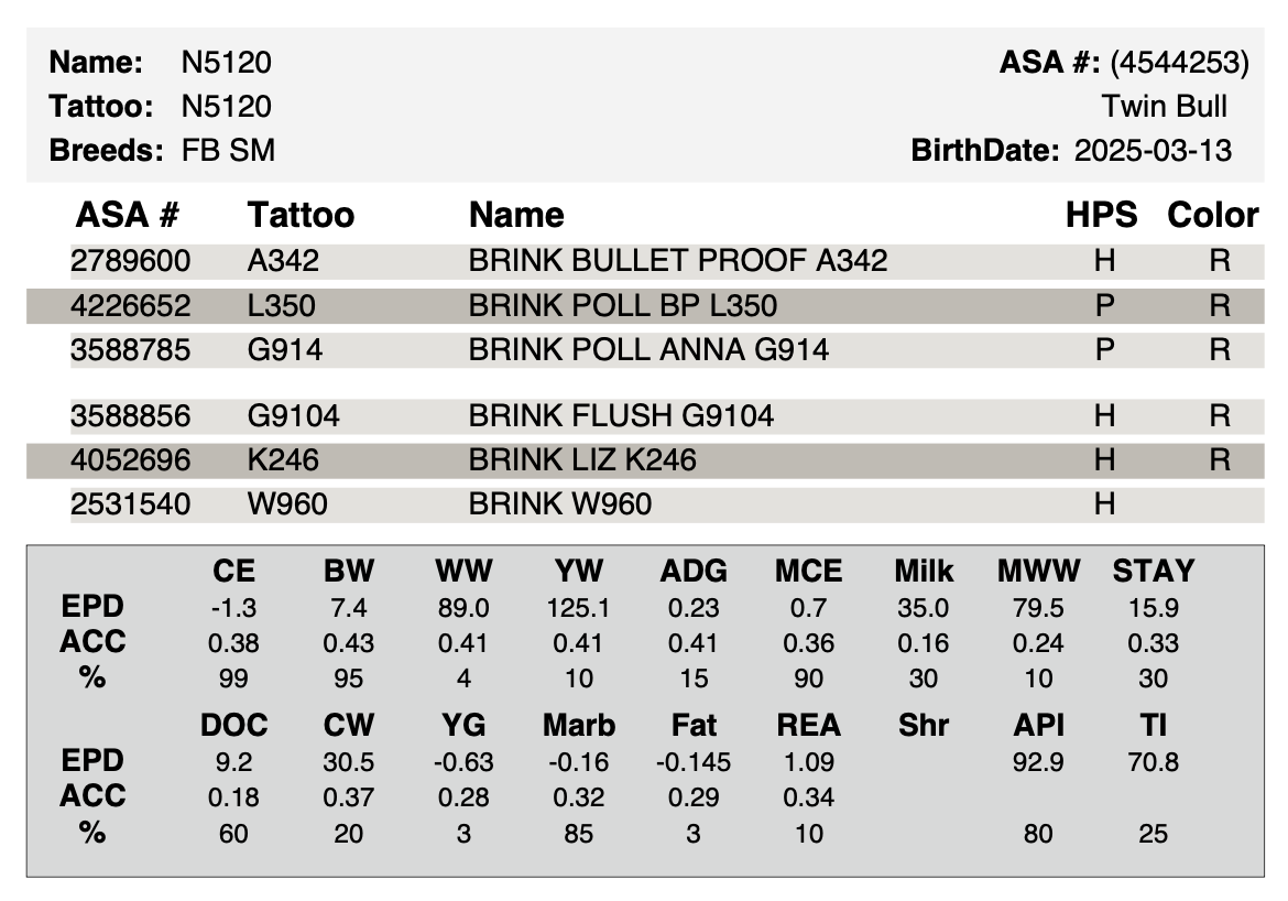 He was the smaller at birth, give him time and he will be ready for late summer or fall breeding. His dam 246 is big ribbed with excellent udder and full of muscle. Top 5% for weaning weight epd index.