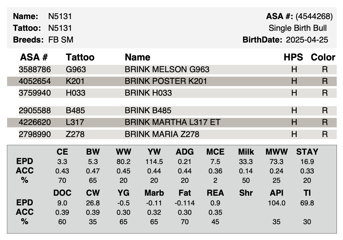 A young standout here for late summer or fall breeding. Dam is a full sister to past herd sire Trunk. This is a very good blend of Poster and 317. Excellent performance with a strong maternal package.