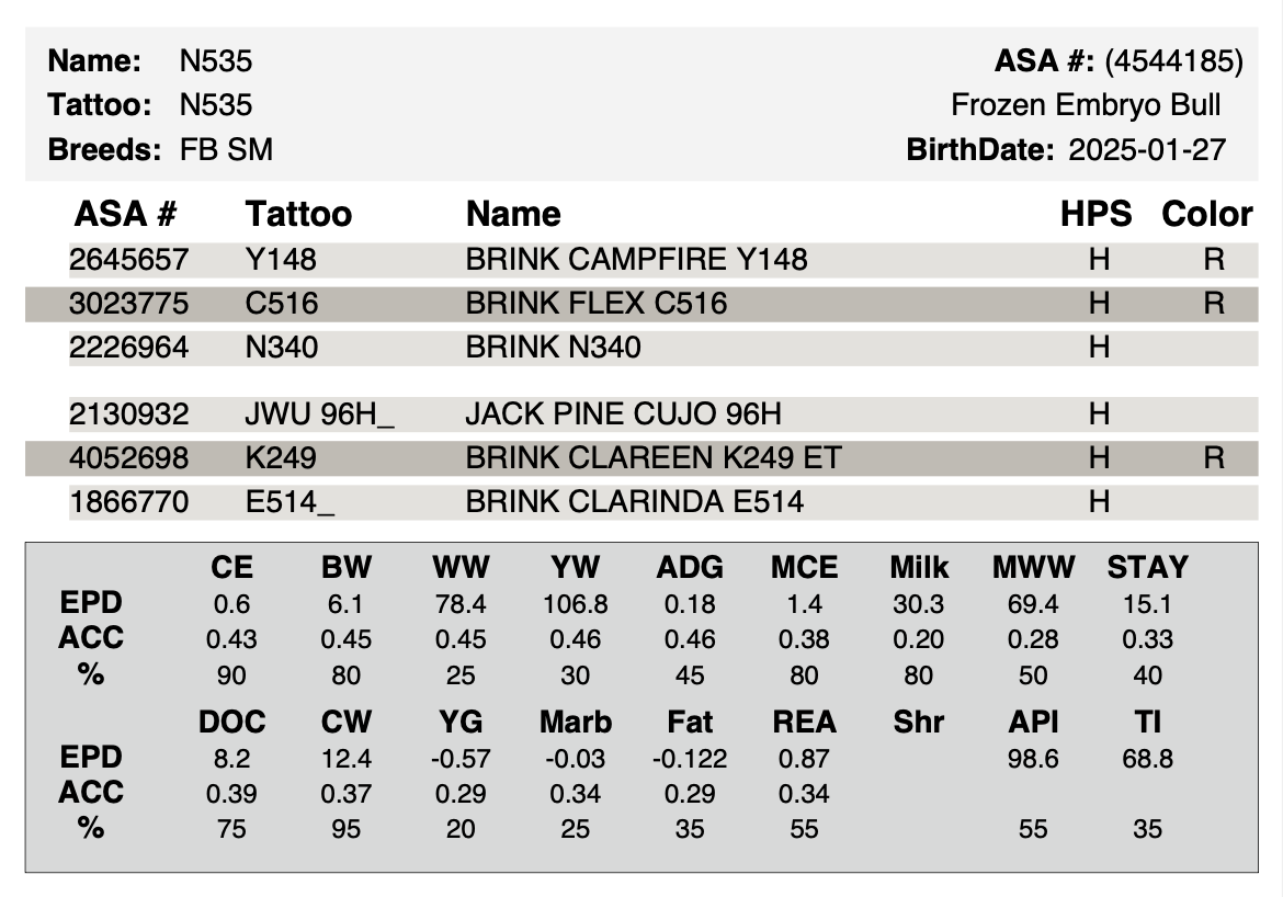 Dam is 249, a direct daughter of the old Clarinda 514 cow sired by Cujo. We have used three full siblings to 249: Brink Jagg (born 25 years ago) along with Linda and Rose that are strong in our current lineage. 535’s sire Flex also has Jagg and Sapp in his pedigree, which are Clarinda’s sons. 535 has length with muscle and should leave strong females like his ancestors did.