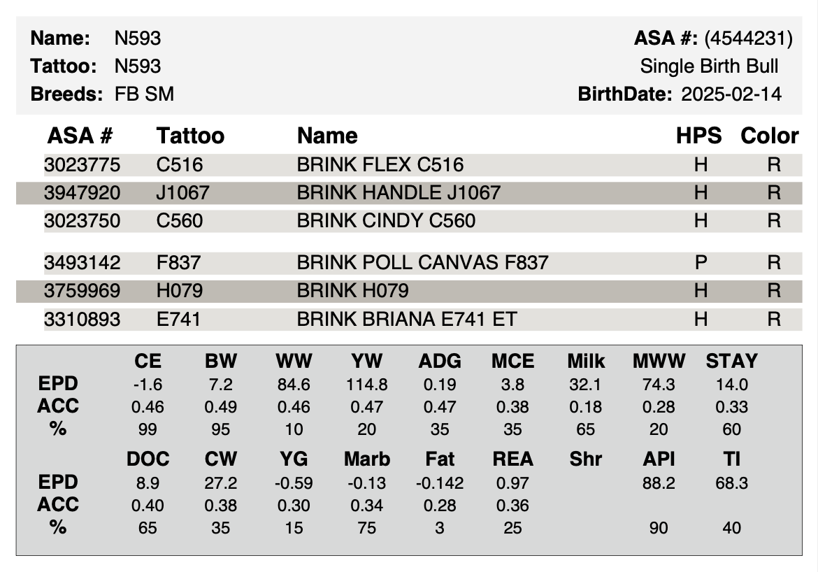 Dam 079 is a daughter of the 741 cow who is a maternal sister to Bullet Proof, Campfire, and Bootstraps. He is long, correct with muscle, and packs performance. 079 has strong maternal traits with a very good udder.