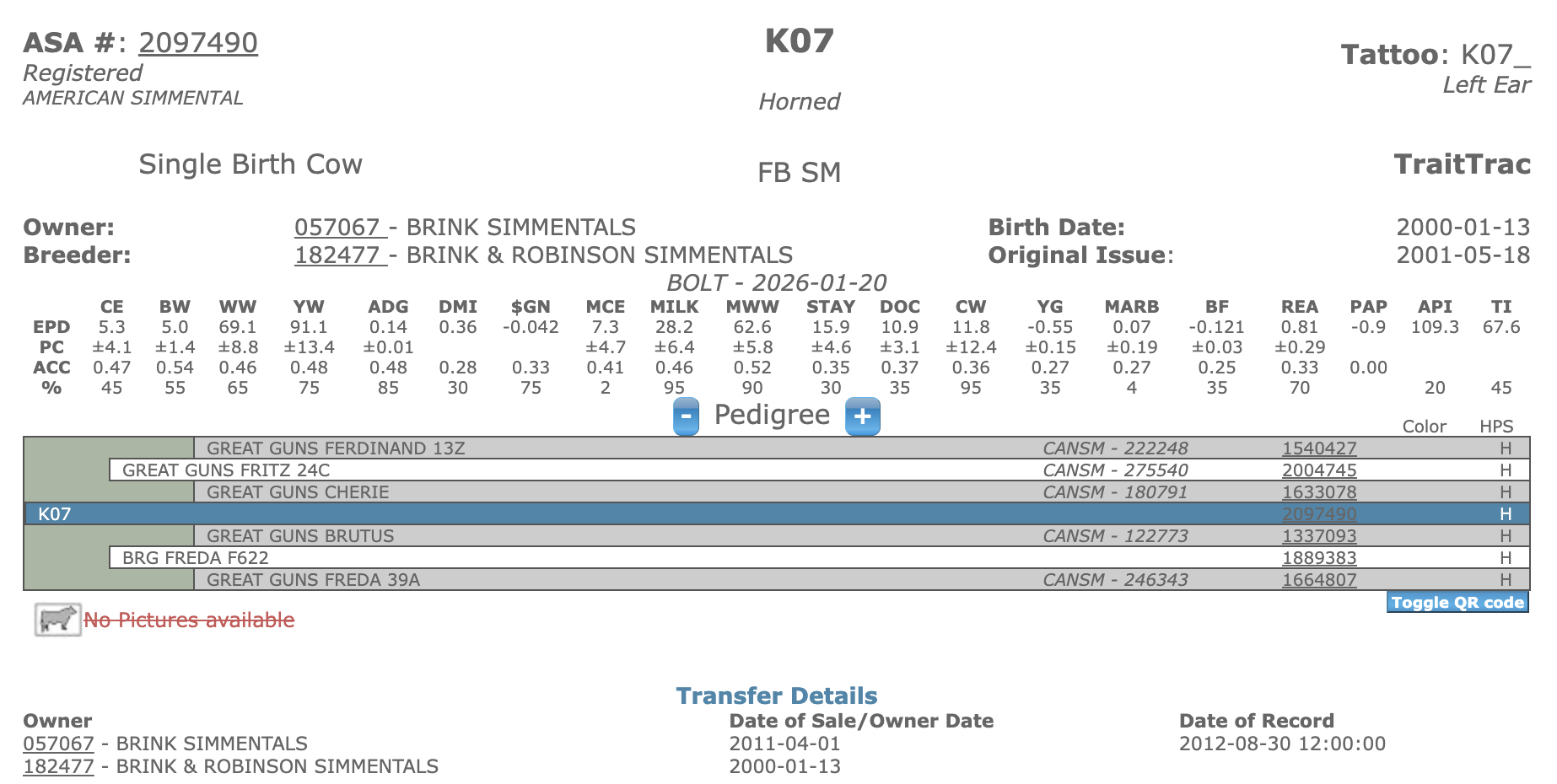 FOUNDATION FEMALES K07 ASA#: 2097490Dam of Herdsire Brink Amos S621Dam of Brink Marietta Y129Dam of Brink T705 Cow Dam of Herdsire Brink Amos S621 Dam of Brink Marietta Y129