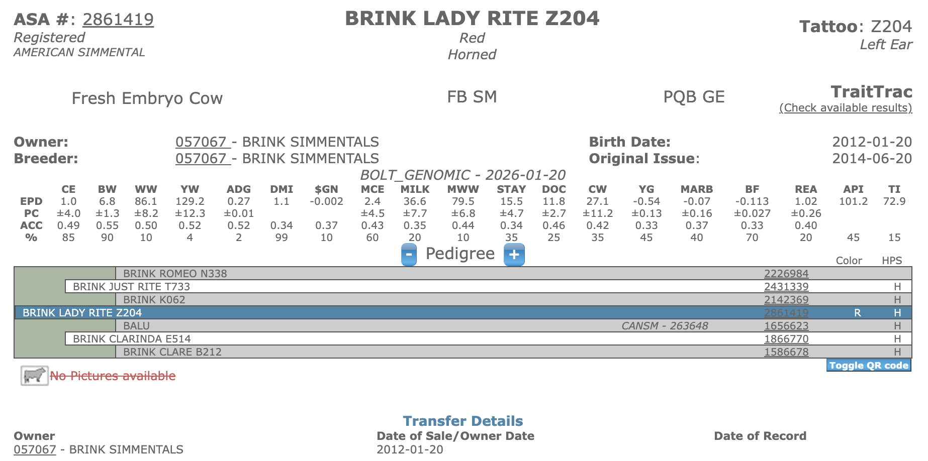 FOUNDATION FEMALES Brink Lady Rite Z204 ASA#: 2861419Dam of Herdsire Brink Flush G9104Dam of Herdsire Brink D600 ETGrand dam of Herdsire Brink Rocky E705 ETDirect daughter of Clarinda E514 Dam of Herdsire Brink Flush G9104 Dam of Herdsire Brink D600 ET