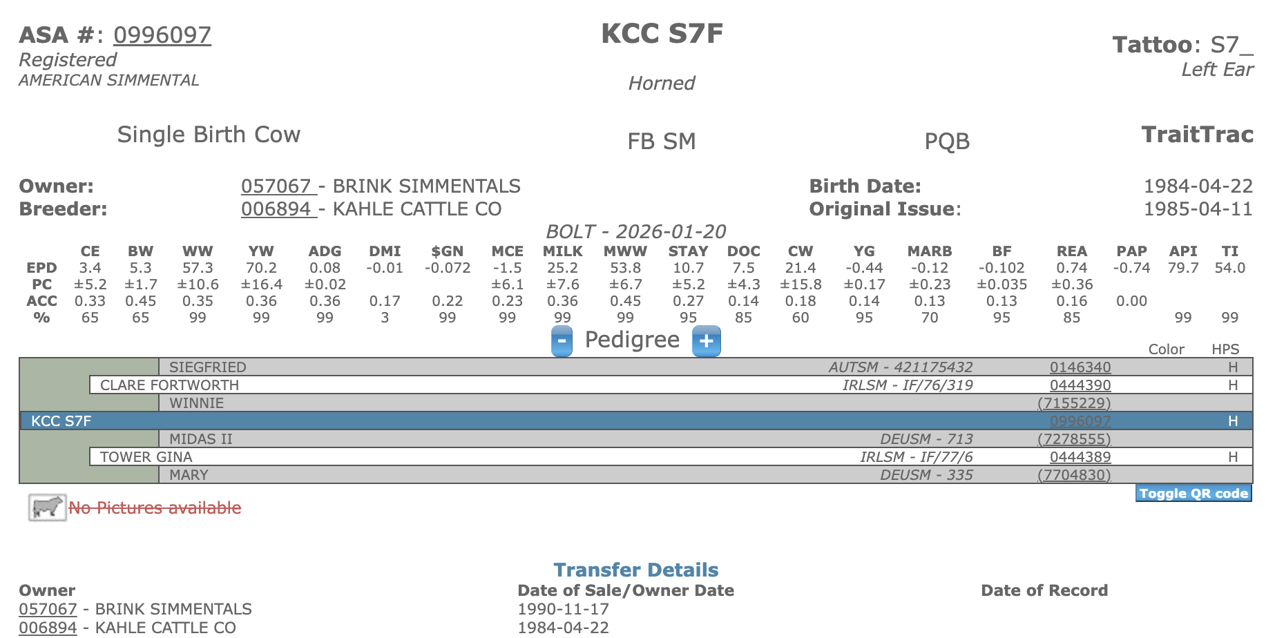 Clare S7 is the grandmother of Brink Clarinda E514. Amazing how influential great cows are 40 years later.