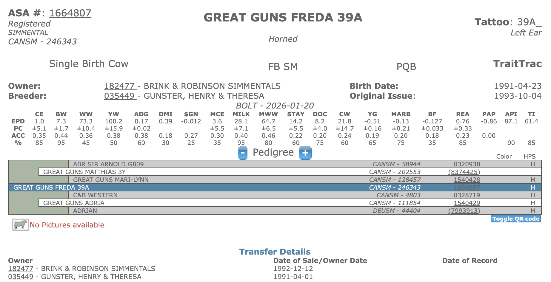 FOUNDATION FEMALES Great Guns Freda Freda's dam, 99S, is a full sister to C & B Western 2nd. Freda was the top seller at the Fleck Fest in Edmonton. A strong cow family!