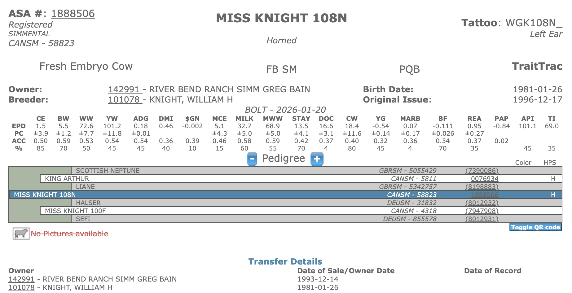 Susie is the dam of Knight Stinger, Knight Mr. "T", and Cerise. She was just short of 13 years old when we bought her at the 1993 Knight Dispersal. We flushed and got son, Contract, and a daughter of Zamuto. She was a real leader in pigment, udder, feet, hardiness and power.