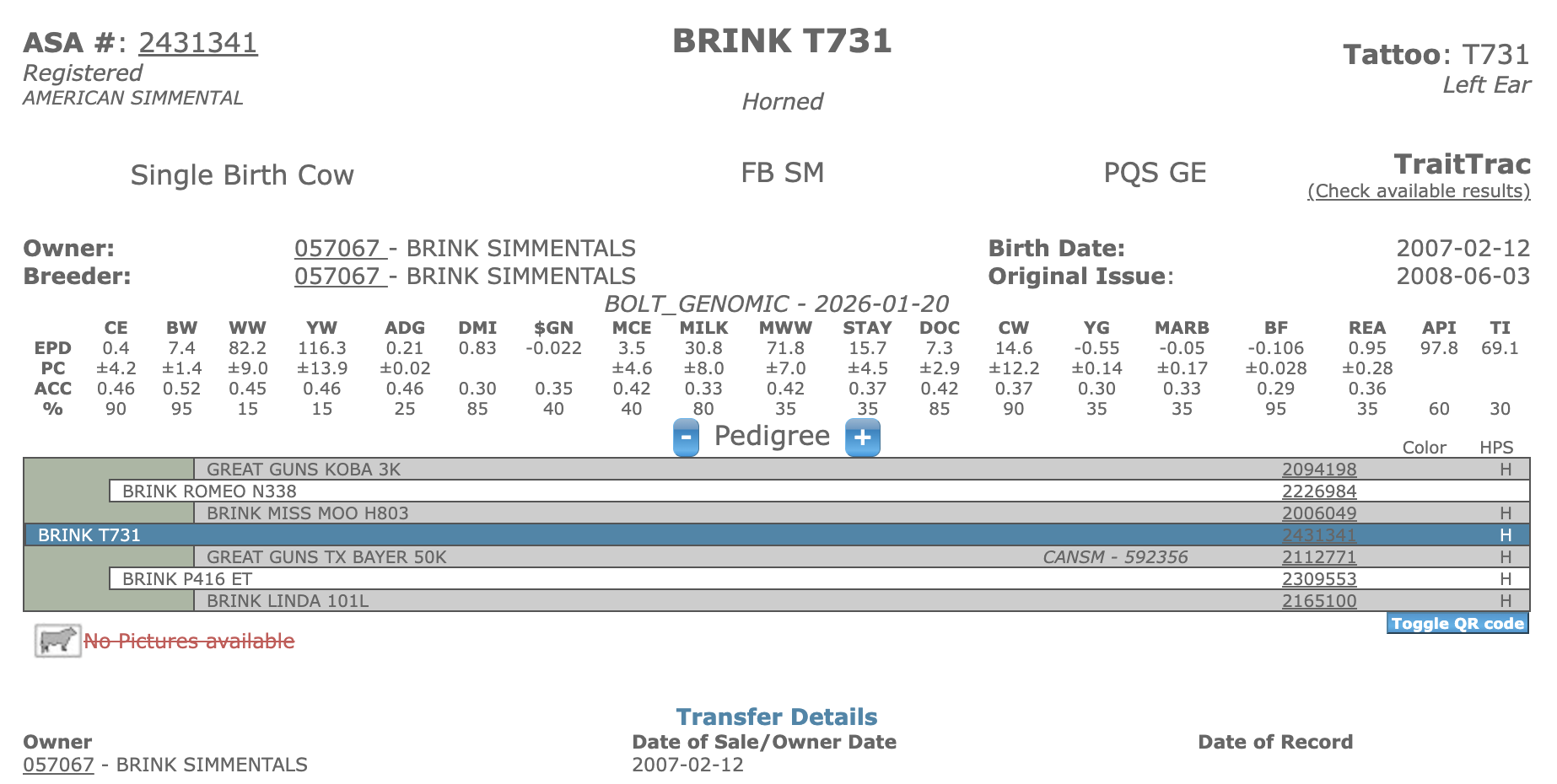FOUNDATION FEMALES Brink T731 ASA#: 2431341Dam of Herdsire Brink Levi X011 Dam of Herdsire Brink Levi X011