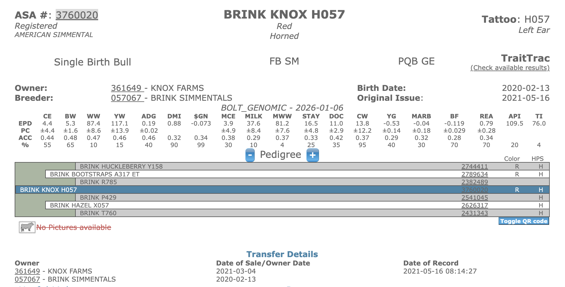 Birth wt: 90lb | 205 wt. 960lb | Yrl wt 1537lb | 18.4" rib eye Choice marbling score