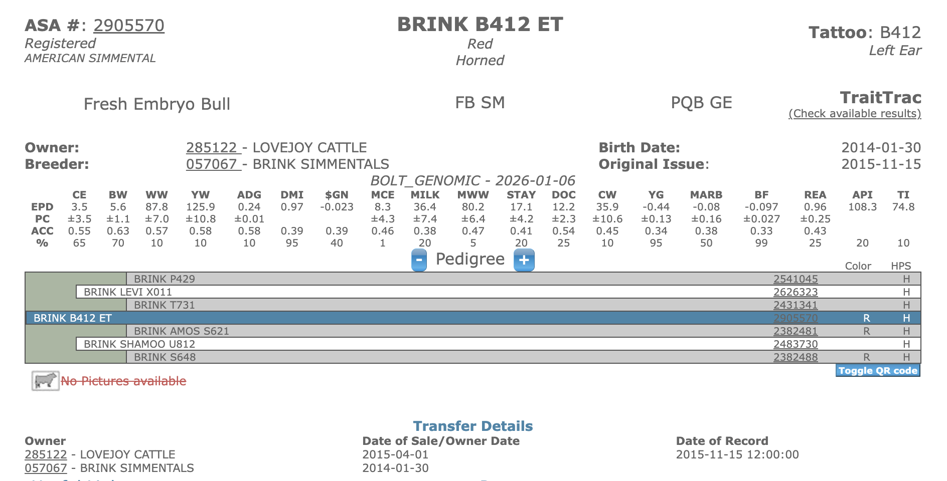 Top selling bull of the 2015 sale. 412 is much like his dam Brink Shamoo U812 with his body size, function, muscle and performance. His full sisters are making big contributions to the program.
