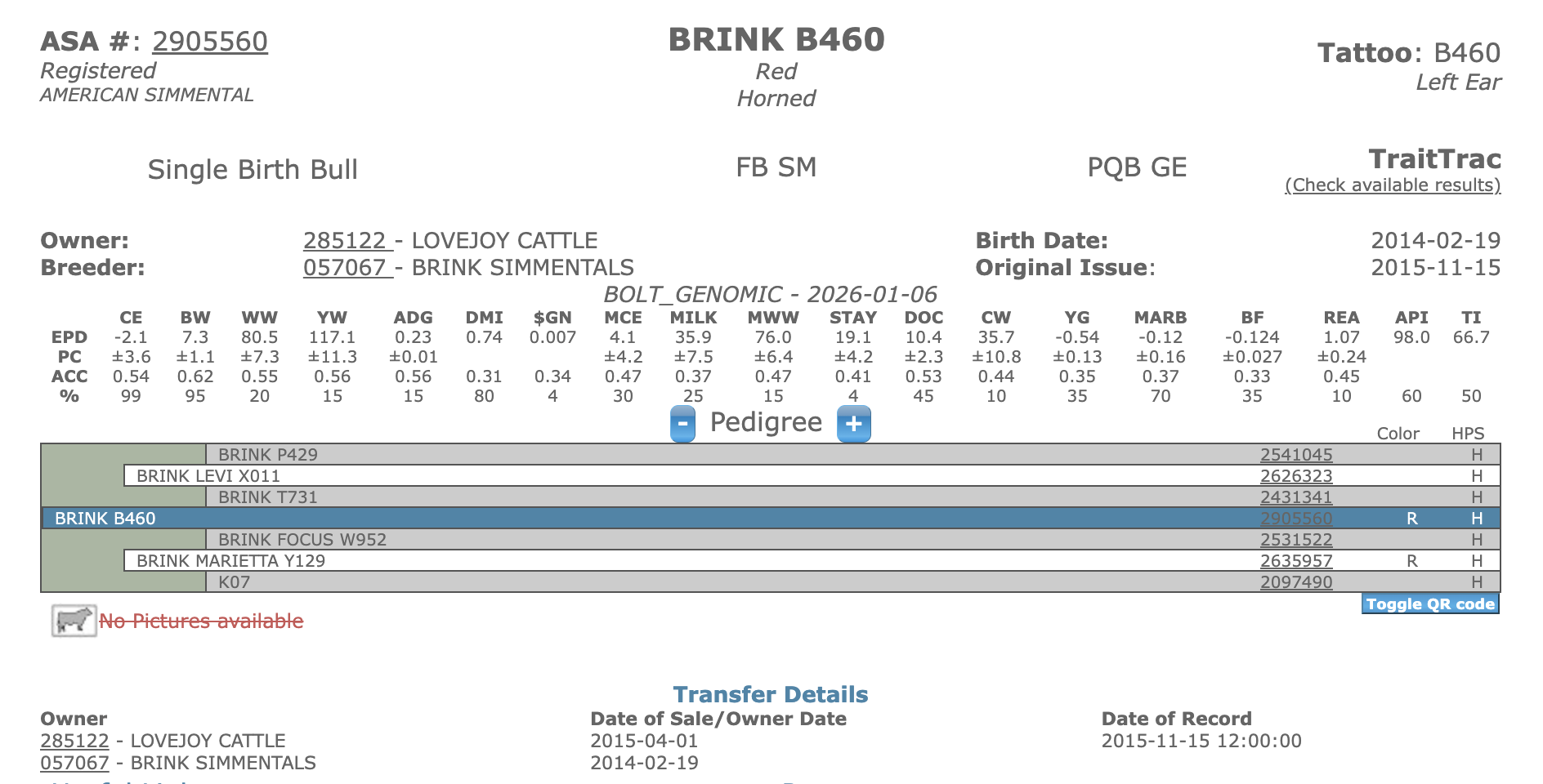 460 adds length, depth, with smoothness. 460 is a grandson of the K07 cow which was dam of Brink Amos S621. Dam Y129 is high capacity with muscle and loosness on an angular skeleton. 460 is the sire of herd sire Brink Rocky E705 ET.