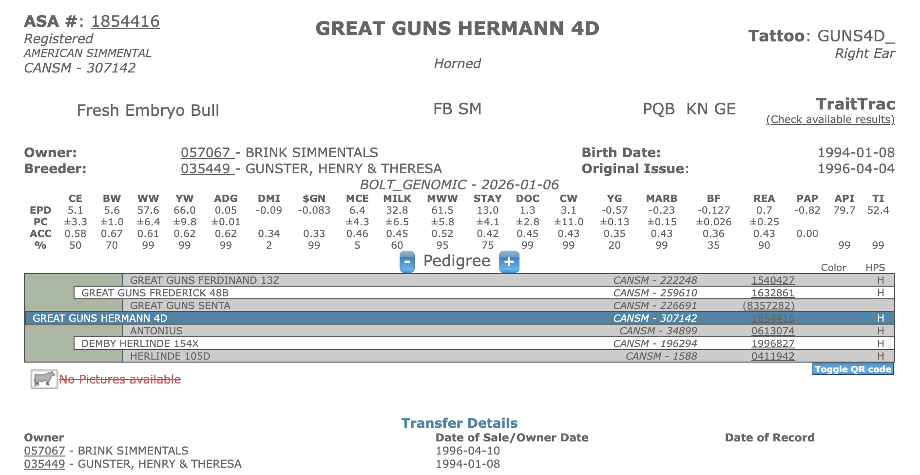 We bought Herman in the summer as a yearling when Great Guns was breeding their heifers. Herman makes excellent udders, good growth, thick centered cattle. Clarinda 514's first calf, Rage, is what we continued the Herman influence with.