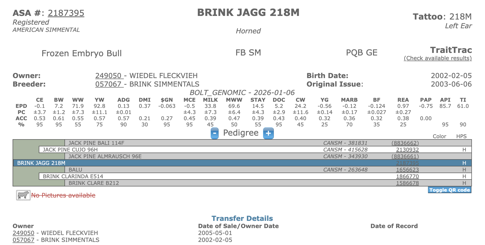 His first calves are extra good. The bulls are stout and the heifers are feminine with Clarinda's good looks. His full sister, 101, is in transplant and quality to burn with the first set on the ground.