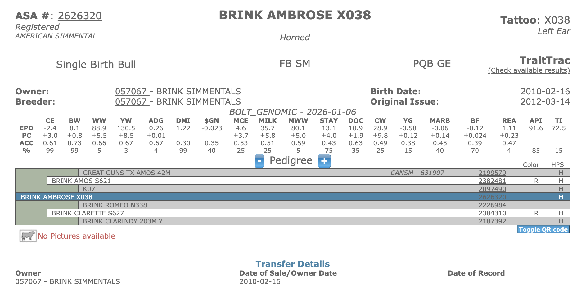 Ambrose offers performance, maternal calving ease with everday production. He weighed 1470# at 11 months old. He is the performance king in our population. Ambrose is extra long, loaded with muscle and that smooth front with a sound skeleton. His disposition is the best. We have identified his top daughters to carry on his performance through their sons. Ambrose is a blend of 6 shots of Seigfried and 6 shots of C&B2nd on the sire sired along with our long standing cow families.