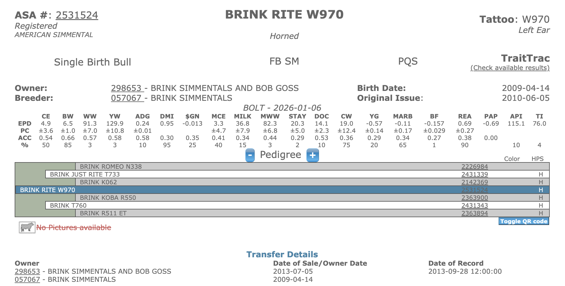 Rite is the 1st calf from the 760 cow and after weaning 3 bulls, which all have been over 900 lbs. at 205 day weight. 760 appears to have locked in performance. Rite is a big footed bull with performance and production. 760 has a short teat, high performance tight udder. His sire Just Rite has left some outstanding maternal females, which we will be keeping sons out of.