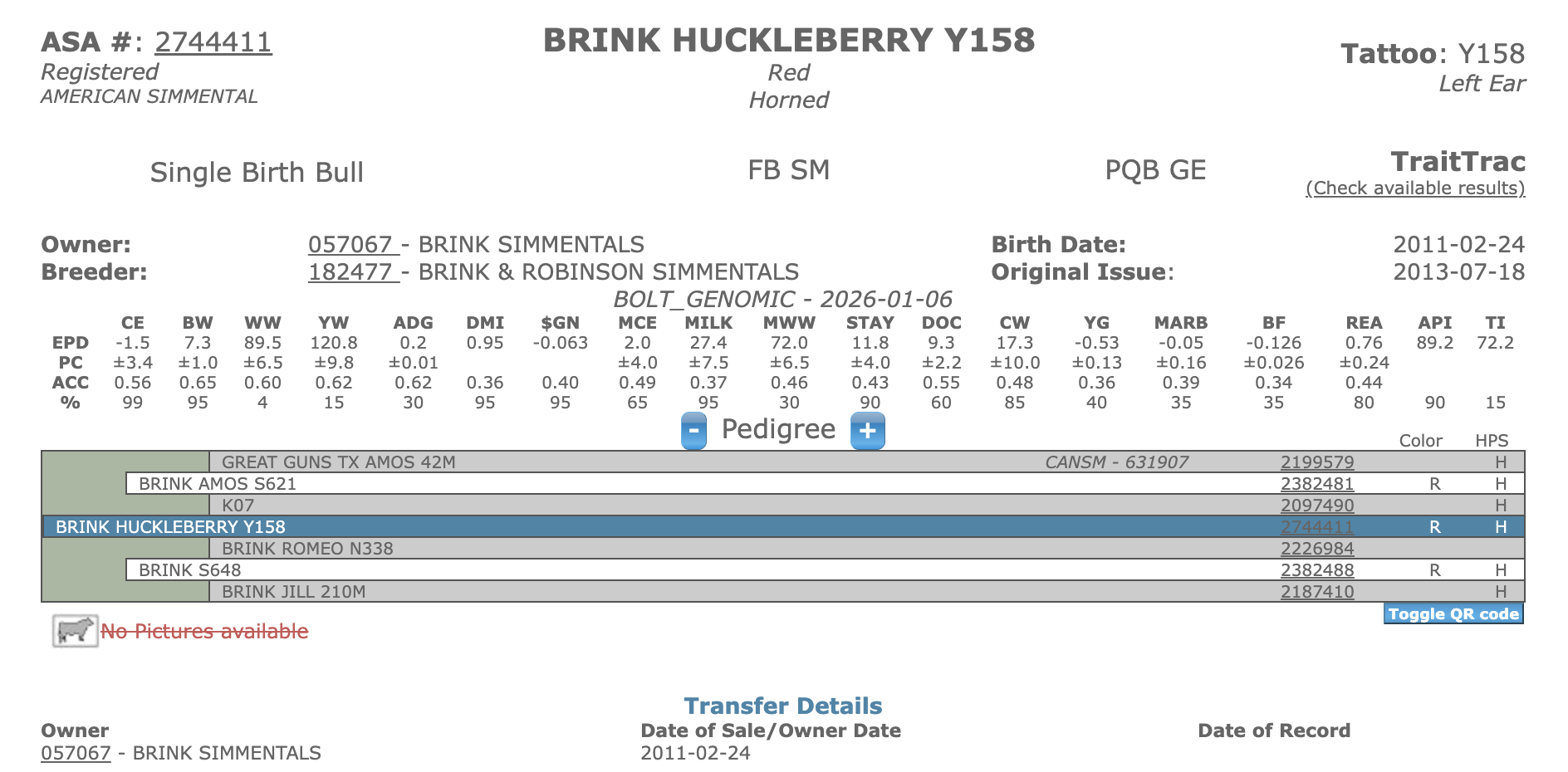 Huckleberry is a full brother to Brink Focus 952 and Brink Shamoo 812. Their dam Brink S648 has been a real matron to work with her generating ability. Huckleberry is a real athlete with that bred in accelerated performance that generates profit.