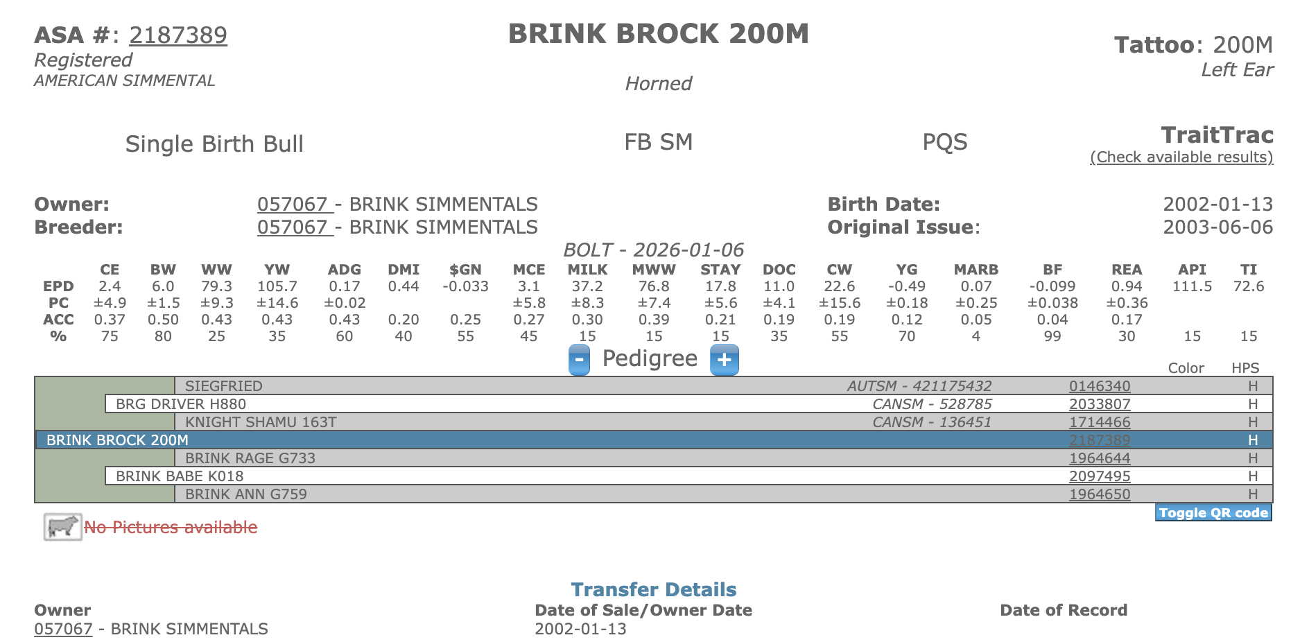 BROCK is the most exciting young bull we have raised with all things measured. He has CLARINDA and SHAMU for his grandmothers and BABE, that did an outstanding job for first calf heifer. BROCK is backed by many strong Fleckvieh sires. Driver, Balu, C&B Western II, Siegfried, King Arthur, Arnie 8M, Romulus, Rage, and Moses. Brock has tremendous thickness and balance; moves like a cat.