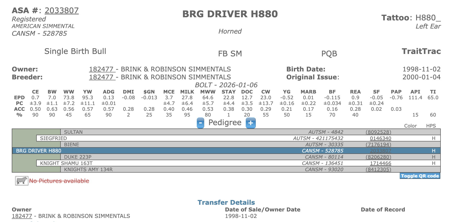 Driver was weaned off his dam at over 1,000 lbs. at 10 months and no creep. His first calves were yearlings in 2002. They are attractive, with excellent conformation and good balance. We are very pleased with his first crop.